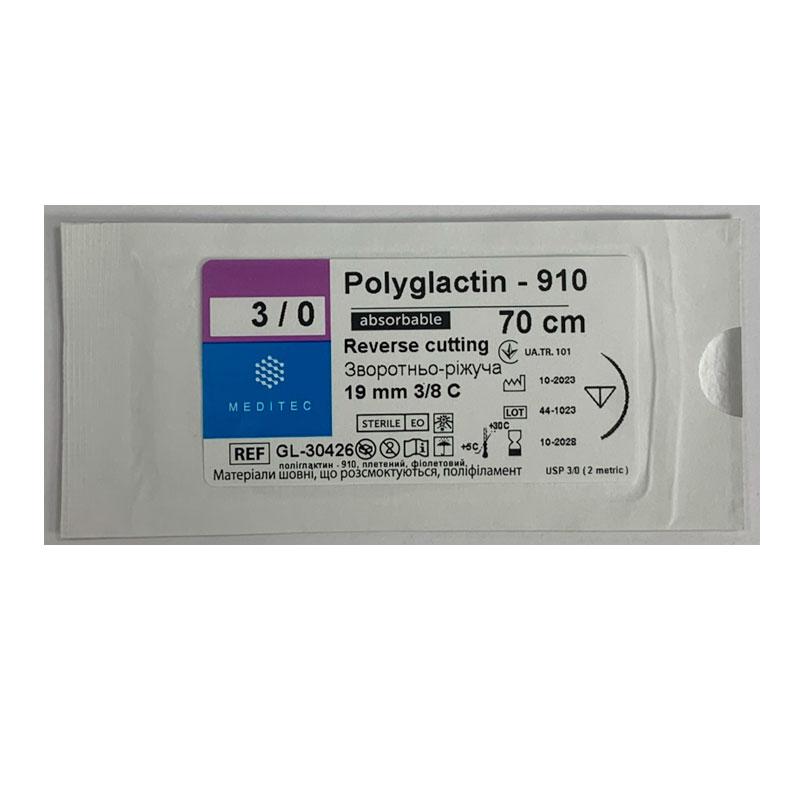 Матеріал шовний хірургічний, що розсмоктується полігліколід-лактидний, USP 3/0, плетений, фіолетовий, довжиною 70 см, з зворотньо-ріжучою силіконізованою голкою кривизною 3/8 кола, довжиною 19 мм.