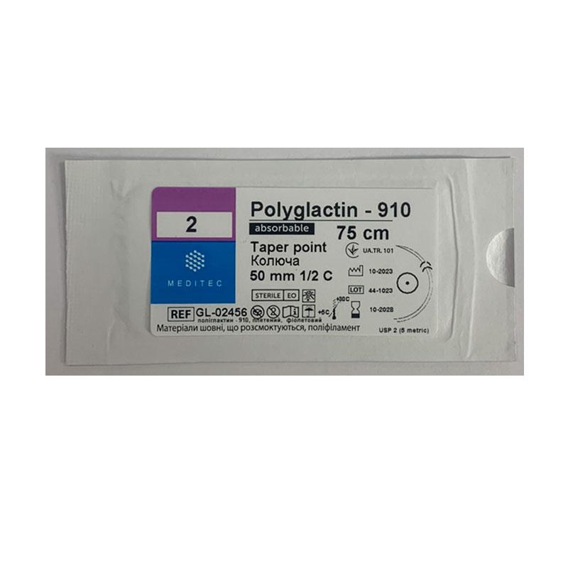 Нитка хірургічна стерильна з голкою, Поліглактін 910, Плетена, 2(5,0), довжина нитки, 0,75, м, розсмоктується, з покриттям, 1/2 кола, довжина голки, 50, мм, Колюча, Одно-голкова, без петлі, без насічки, Фіолетовий