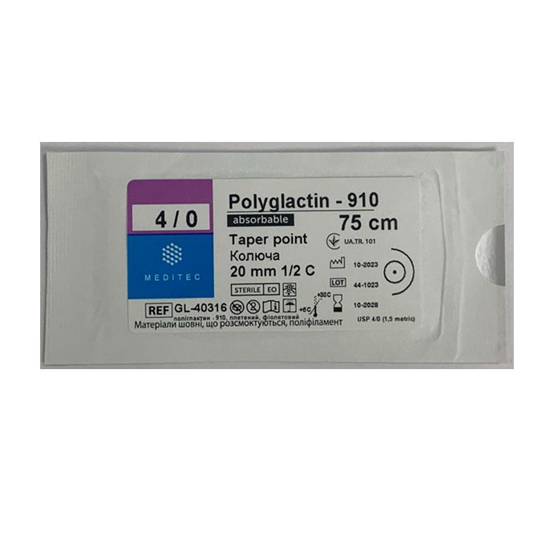 Матеріал шовний хірургічний, що розсмоктується полігліколід-лактидний, USP 4/0, плетений, фіолетовий, довжиною 75 см, з колючою силіконізованою голкою кривизною 1/2 кола, довжиною 20 мм.