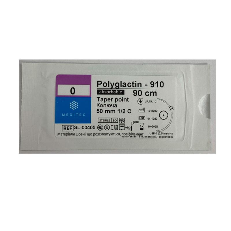 Матеріал шовний хірургічний, що розсмоктується полігліколід-лактидний, USP 0, плетений, фіолетовий, довжиною 90 см, з колючою силіконізованою голкою кривизною 1/2 кола, довжиною 50 мм